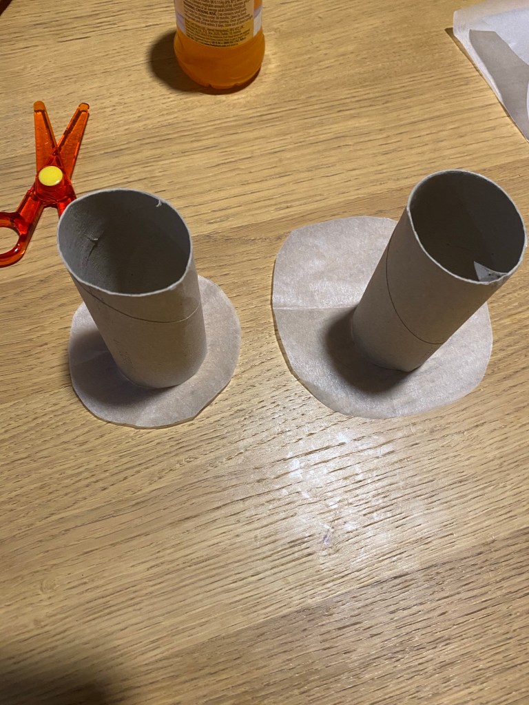 We started off very well, with the children getting very excited about it having previously told me they did not want to take part. I drew a circle on the baking paper that was larger than the diameter of the toilet roll and handed these circles to the children to cut out. Lesson 1: safety scissors do not work well on baking paper, and in the hands of a 2 year old they are, quite frankly, a liability because she got thoroughly fed up with them very quickly. I abandoned the idea of some nice scissor skills practice for them and cut the circles out myself with proper scissors.
