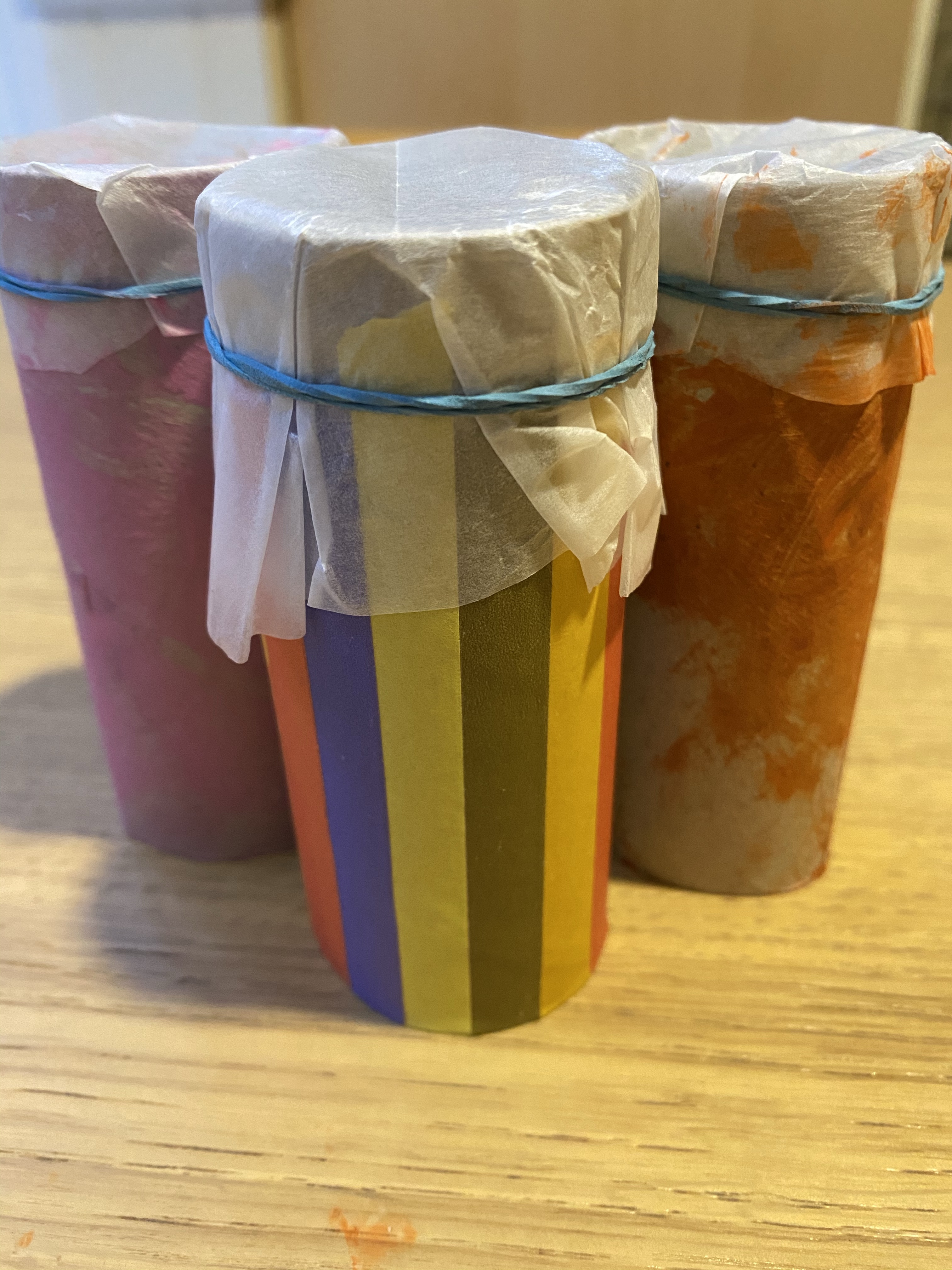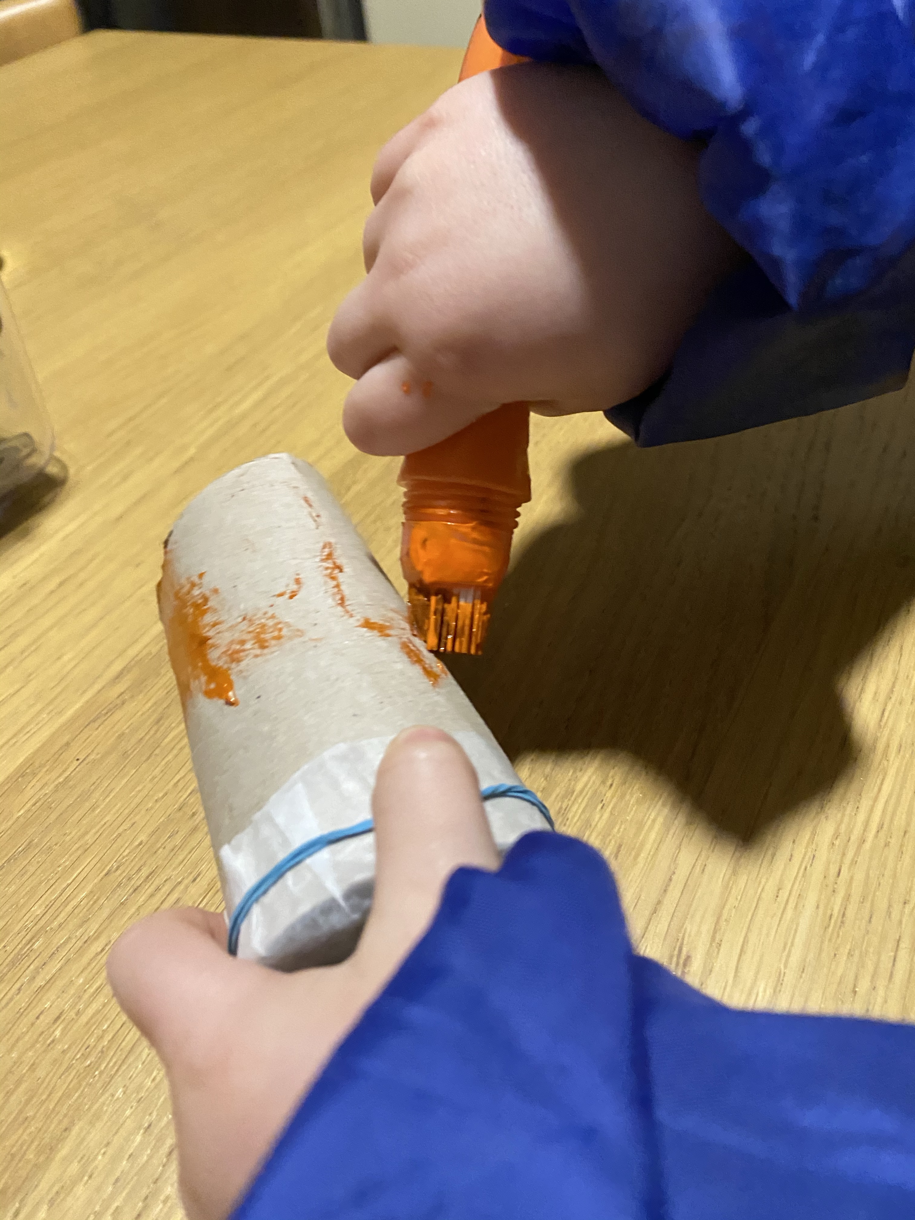 Decoration time, and I chose some washi tape stripes for mine, and the children decided to paint the toilet roll – the baking paper fell off, and got put back on, thrown across the table, squished, and redone. I just about stopped myself from wishing I had never started this with them.