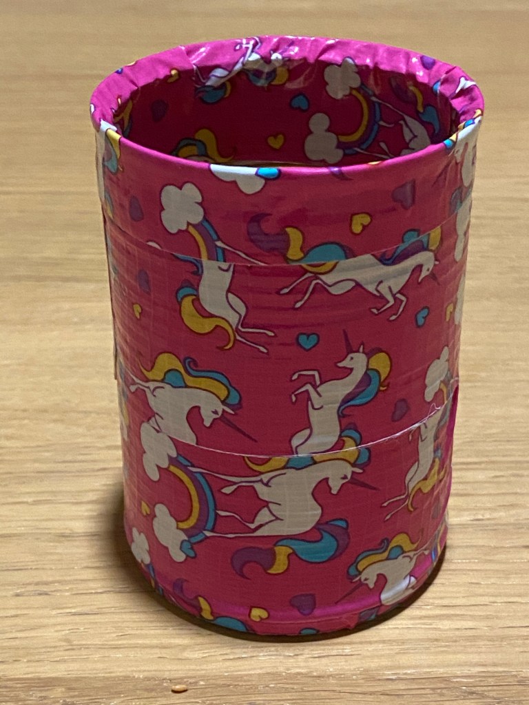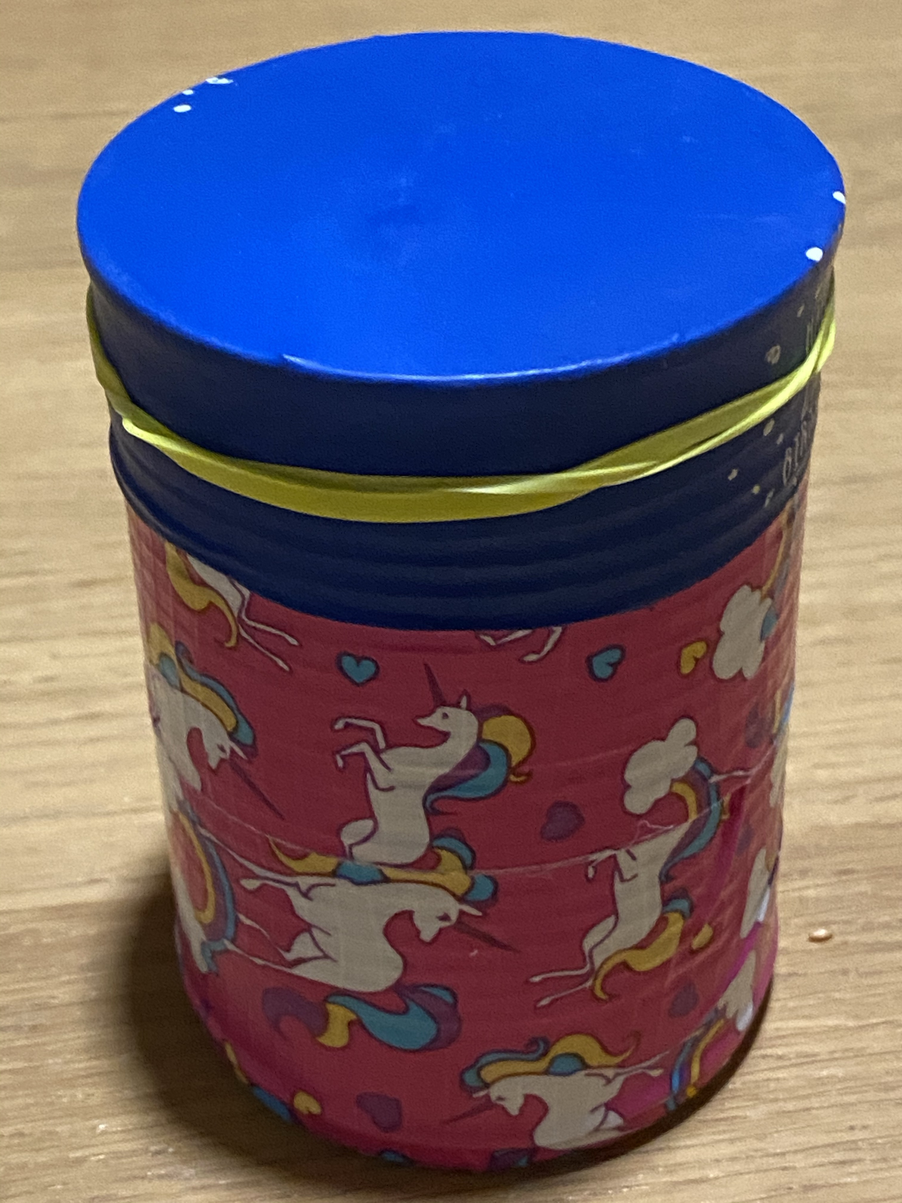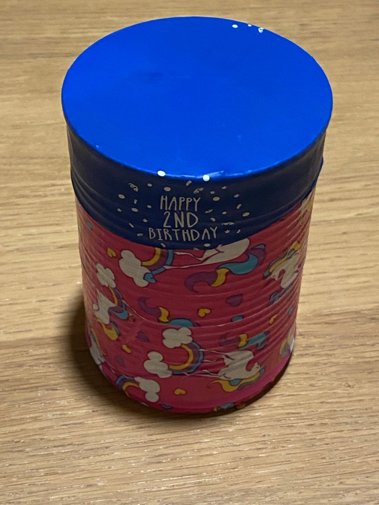 So the first thing I did once my tins were washed and dry, was to cover the tin in dick tape. I did this because when taking the lid off the tin as I was washing it I slightly cut my hand on the sharp edge, and didn’t want little hands to play with the sharp edges. It had the added benefit of making the tin, therefore the drum, looking much prettier with this lovely tape that I found in Wilkinsons a few days ago.