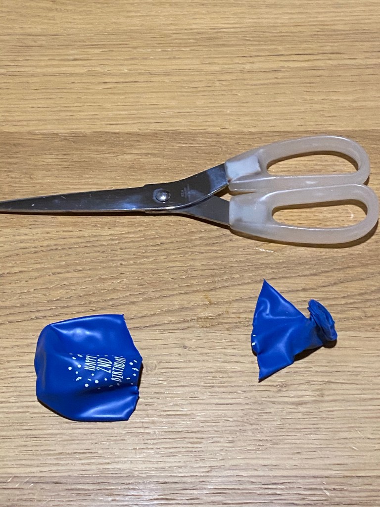 I cut the bottom off a balloon and then stretched it over the top of the tin can securing it in place with an elastic band. You need a nice, tight fit for the balloon, and for the balloon to appear level on the top, this give the right sort of skin for the drum.
