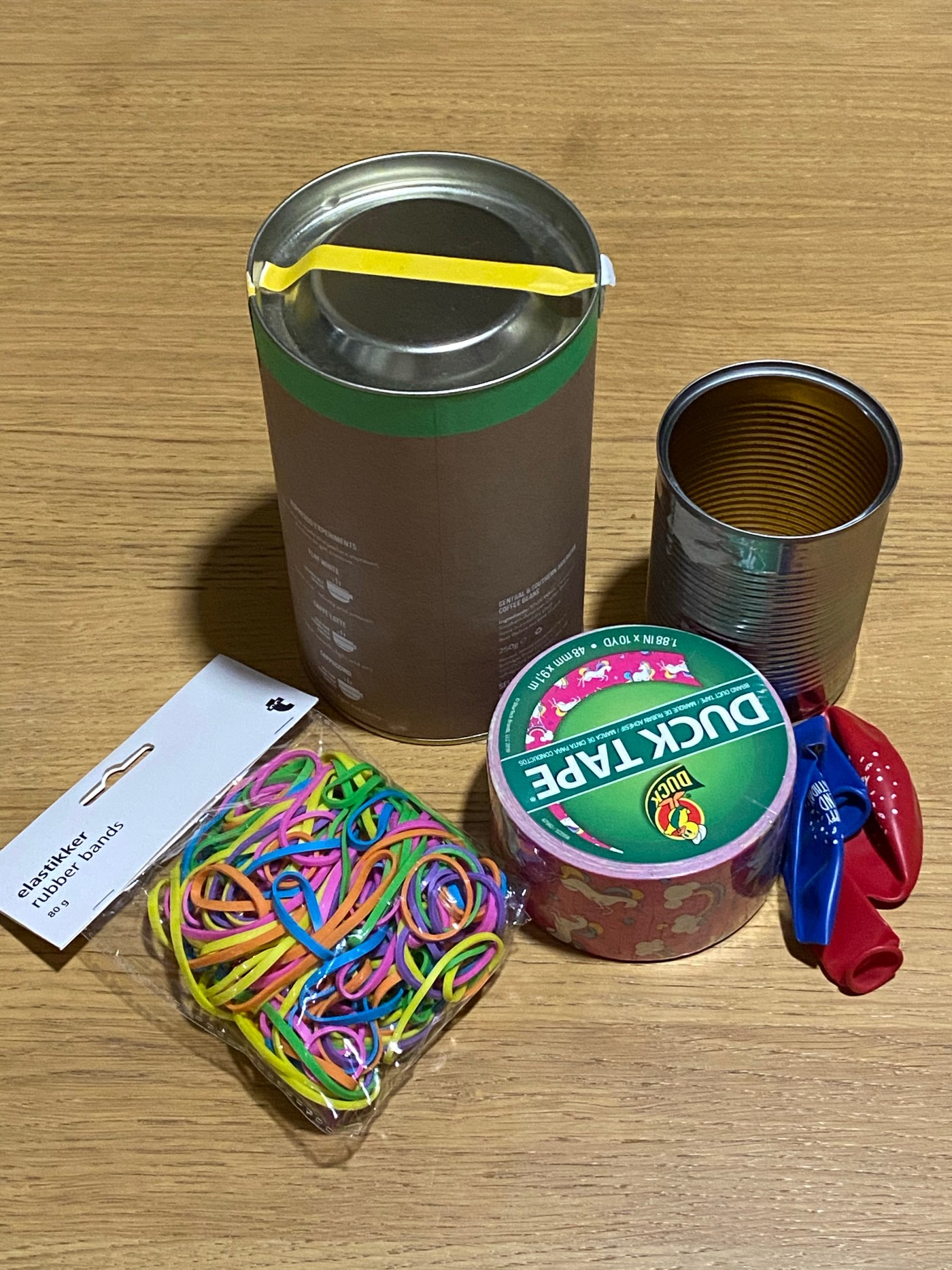 I repeated the process with the second tin can and also the coffee bean canister. The canister was much harder to use. It was much larger than the tin and so the balloon had to stretch far more to cover the top. I didn’t feel like I got a nice, taut and level surface with this. Also, as the sides of the canister were made from card rather than tin, they were not as rigid, and also contributed to the sides moving when the drum was being played, and the top of the drum being less taut, so not making a very good sound. We abandoned this drum very quickly when trying them out.