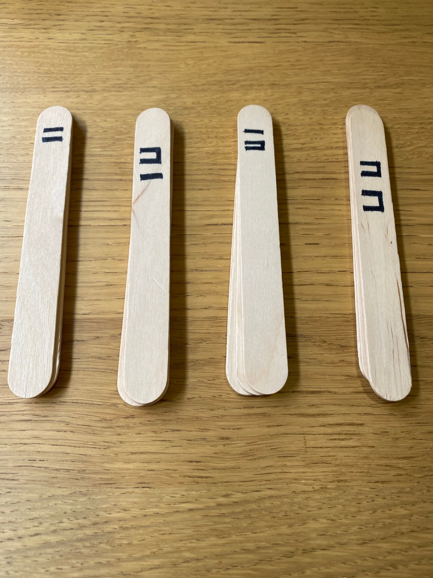 - Tune recognition: place the craft sticks in an order, tap or sing the rhythm and see if we recognise it. This one might be quite tricky with my two.