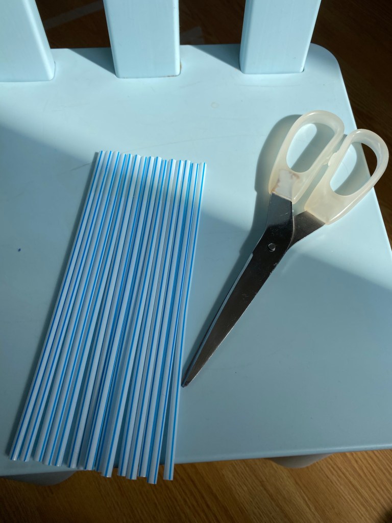 - Straws. We had a stock of plastic straws at home. Paper ones would work as well, but wouldn’t last as long. Silicon straws would not work for this as you need to be able to cut the bottoms off the straw to make the instrument.