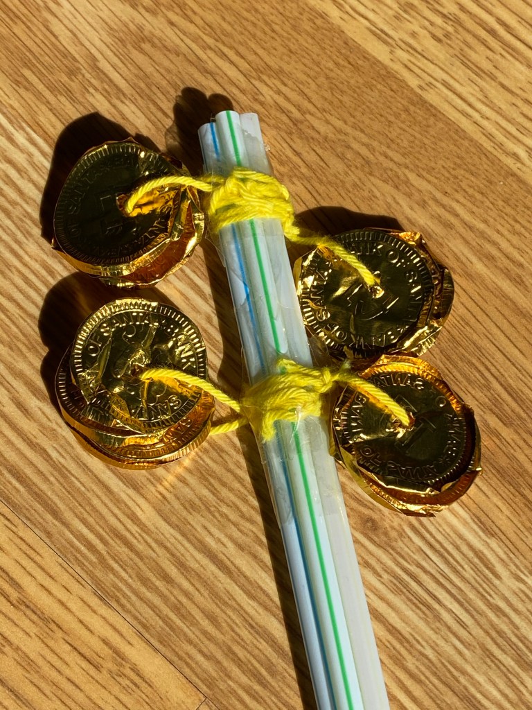 We strung four foil wrappers on each piece of yarn and then tied it around the straws, tying it securely in place and trimming the tail of the yarn.