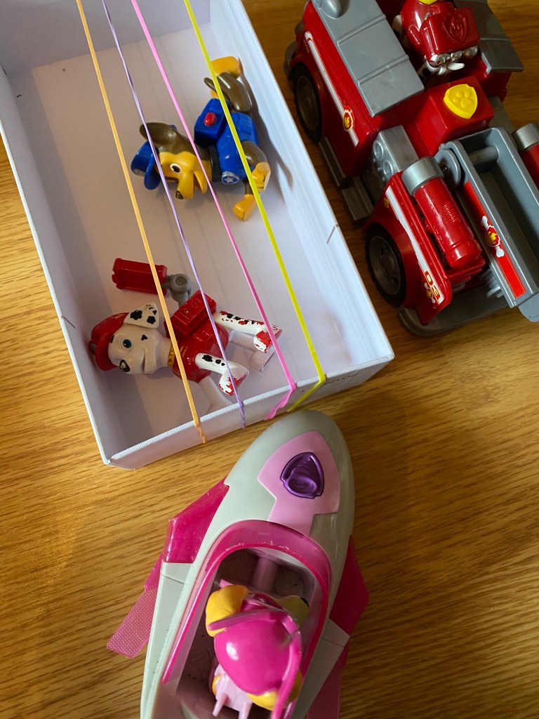 We opted for very plain white boxes as I had been sent a lovely Easter gift in the box. It was a great size for my little hands to hold onto as well. I found some different size elastic bands, some thinner than the others, and it so happened that mine were multi-coloured. We stretched the elastic bands to fit the box and I spaced them out on the box so they were roughly equally spaced. You could tape the elastic bands down but I chose not to.