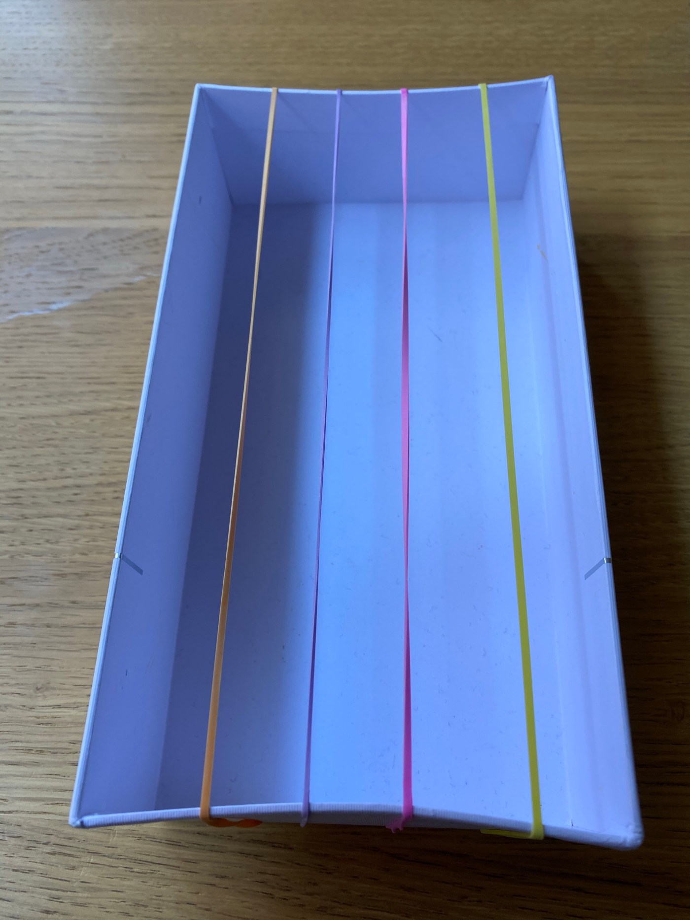 This instrument works on the same principles as a guitar, or any other plucked stringed instrument. When the string, or here the elastic band, is plucked, it vibrates over the space below it. Here it is the open part of the box, and in a guitar it would be the hole under the string. The vibrations make sound. You can change the sound made by using a different length or thickness elastic band. Shorter elastic bands are pulled more taut on the cardboard box and so they vibrate faster when plucked. The faster an elastic band vibrates, the higher pitch we hear and so different length bands produce higher or lower notes. It would be the same with different thickness of elastic bands with thicker bands vibrating more slowly, producing a lower note.