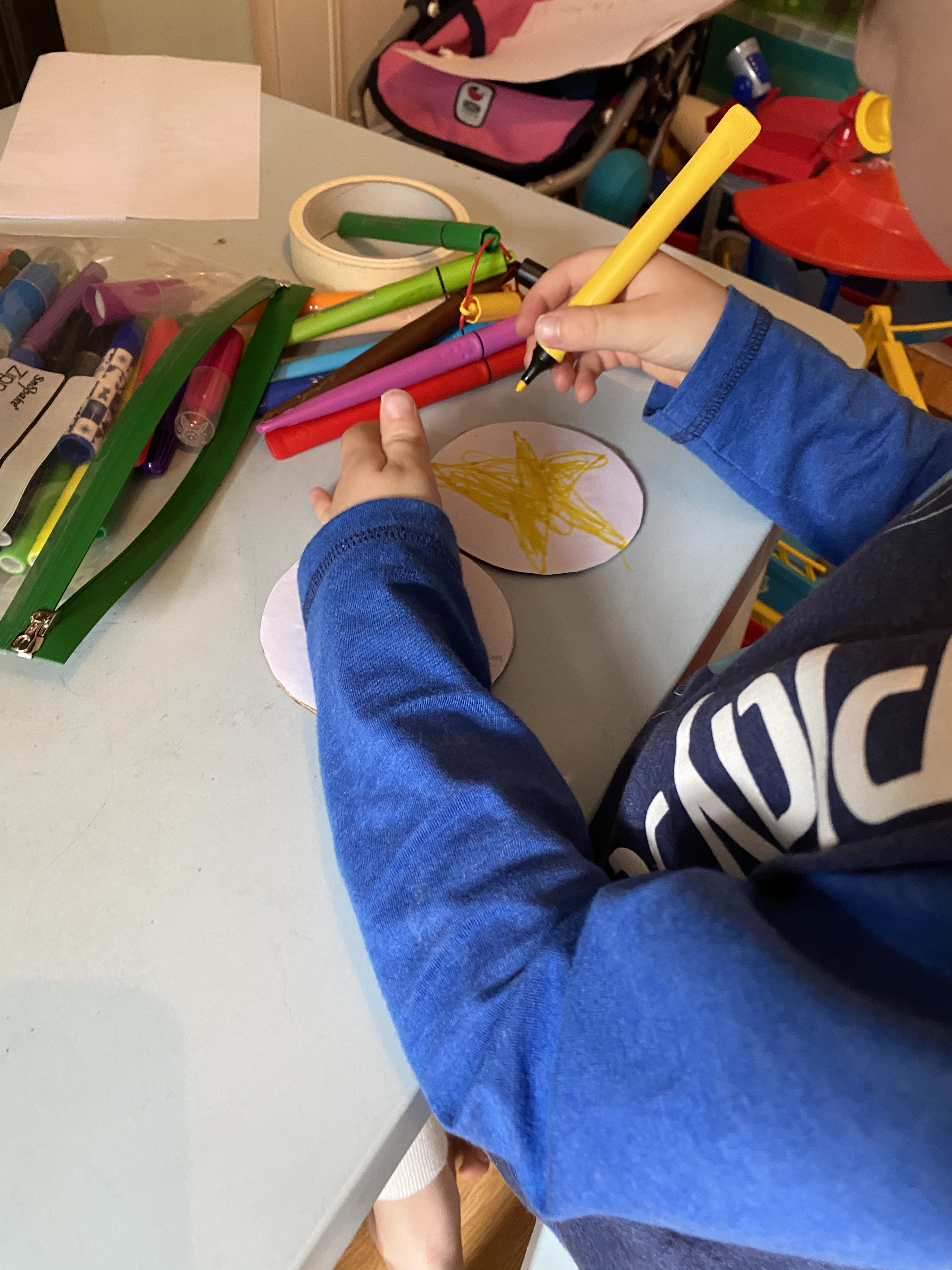 The children used Pritt Stick to stick the paper circles onto the cardboard circles. My son used felt pens to draw a star on either side of his drum, and my daughter used washi tape to decorate her circles. Interestingly, when we started making things with washi tape astound christmas my daughter, who was 2 at the time, would peel off as much tape as she could and stick it mostly to the table, rather than the paper or card we were using. I noticed with this task that she was much more purposeful with putting the right size tape onto the paper and trying to smooth it flat. She was starting to make much more conscious design decisions than haphazardly placing the tape as she had done only a few months earlier.