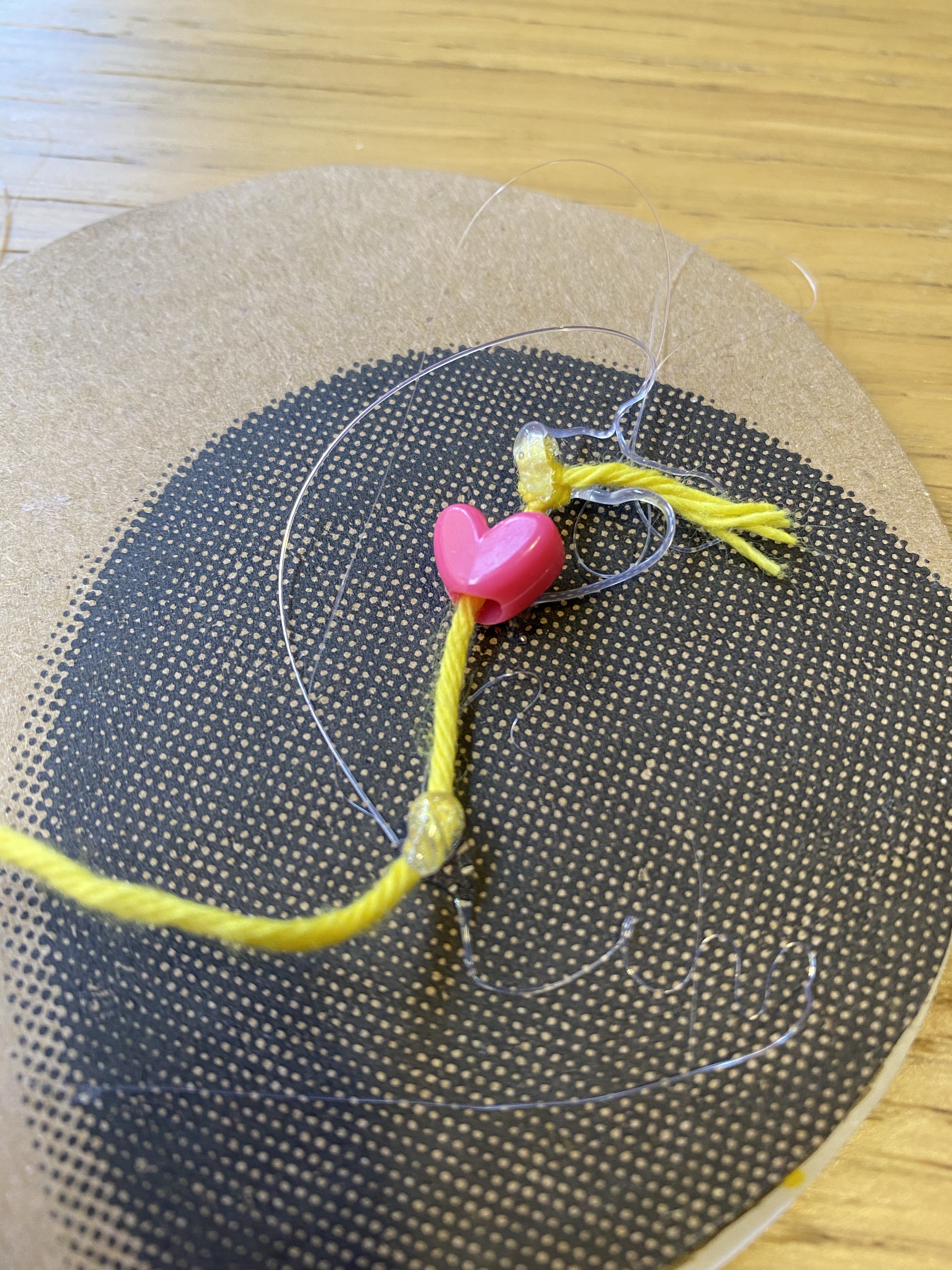 I then placed the other half on top, covering the first circle. Then as our beads kept trying to escape from the yarn (thicker yarn or beads with smaller holes, or even better knot tying would possibly resolve this!), I tried to put a little blob of hot glue on either end of the yarn to keep the bead from escaping. I did not do a very good job with this, and got in a bit of a mess with it!