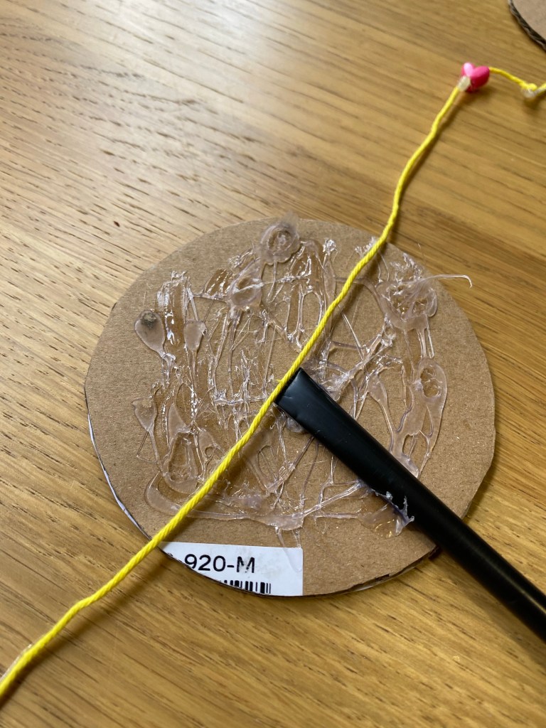 While the children were decorating their drums I cut 2 pieces of yarn. I cut about 4 inches. The yarn or string needs to be around 2 inches or more longer than the diameter of your cardboard circle. It will lie across your circle, so that there are 2 lengths of yarn either side that are roughly the same length. This is easiest illustrated with a picture I think!