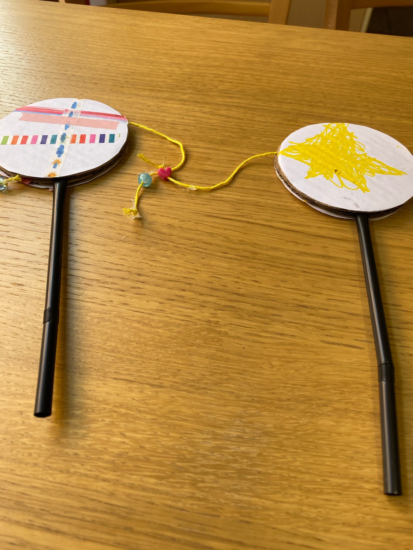 To play the drum, your children (or you) will need to hold the straw in between their palms with the cardboard at the top. They with then twirl the straw around in their palms so that the beads hit the cardboard and make a noise. It is another nice, quiet instrument, but lots of fun. My children have had it out several time since making it. I mentioned above that I didn’t do a great job first time with the hot glue on the end of the yarn – so much so that one of the beads flew off the yarn the first time, so be generous with the glue if you are using it, or tie several really large knots in the yarn/string!!