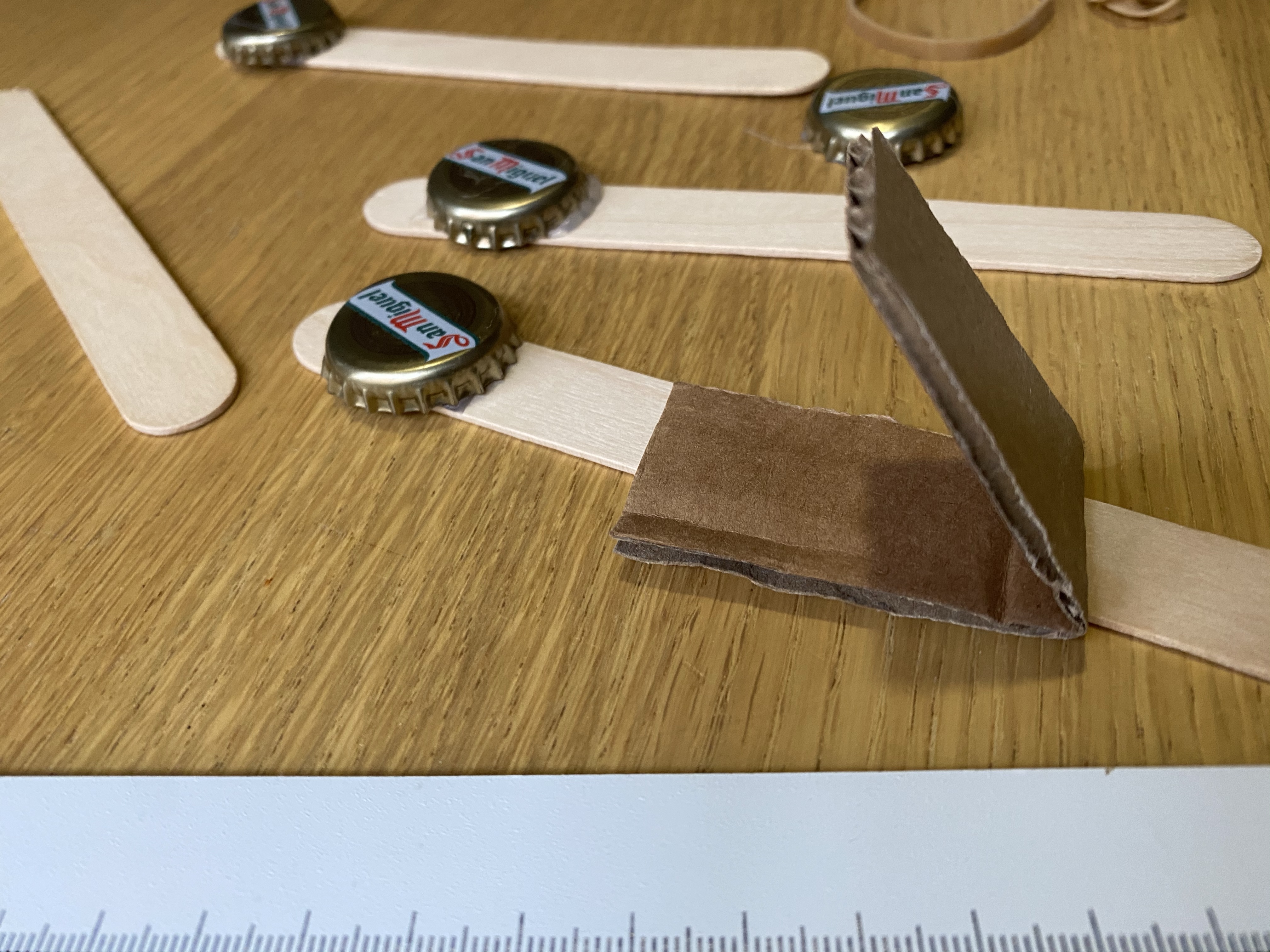 So I cut a small piece of cardboard, mine was slightly wider than my craft sticks, but I could have made more effort to make the cardboard the same width, or thinner than my craft sticks. I folded the cardboard into a V shape and hot glued the cardboard to each of the craft sticks so that the open side of the V faced upwards towards the bottle tops. The cardboard, which made a lever inside the castanet, was approximately half way up and I took care to ensure that the bottle tops would still be level with each other.