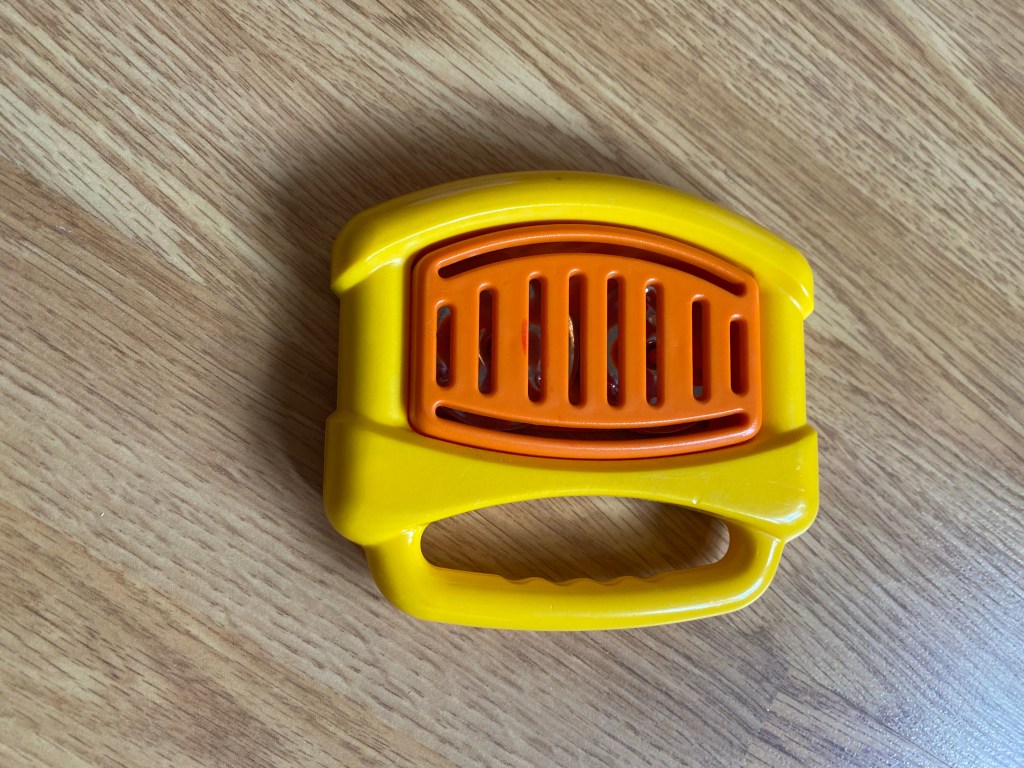Our other mini tambourine does not really look like a tambourine. Again it is made out of plastic. The zils are covered over with plastic as well so that the children cannot actually access them. There is a handle attached to the instrument for easy holding. This type of instrument is the safest option for small children who like to put everything into their mouths as the zils cannot easily detach from the instrument, and if they do detach they cannot escape their plastic container.