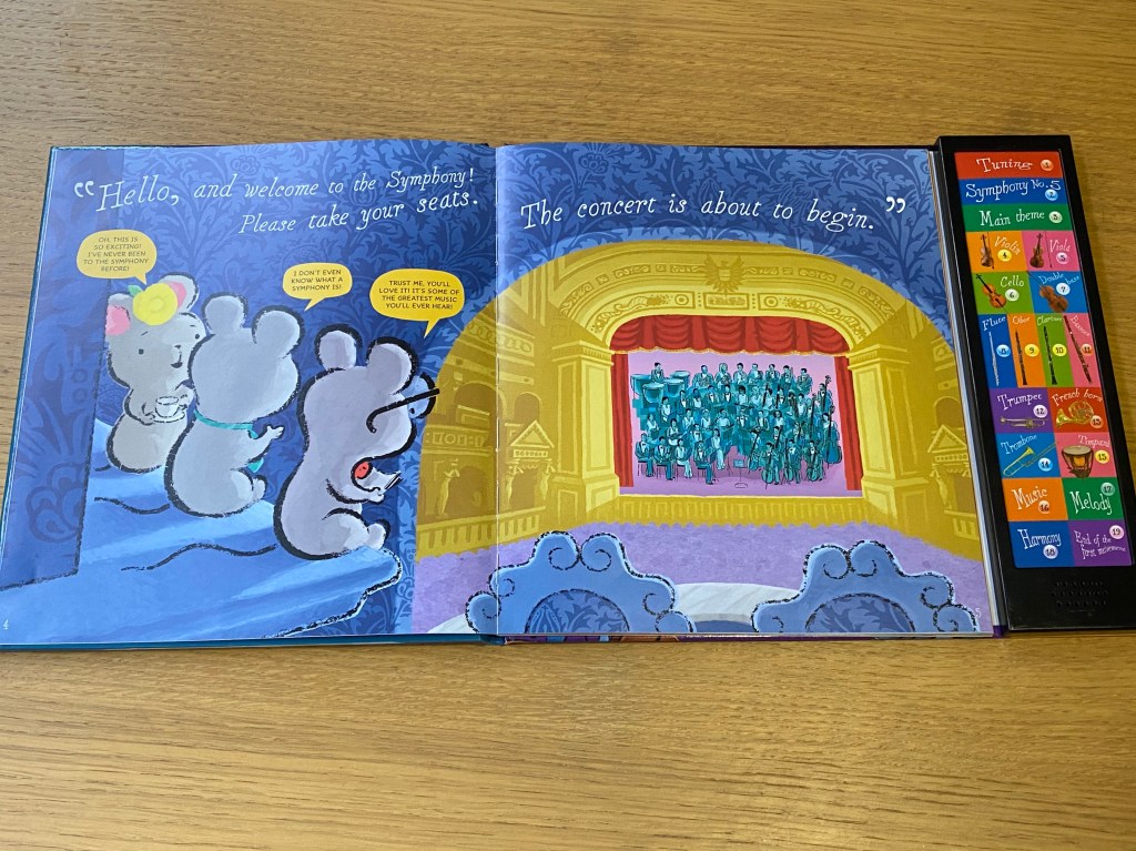 The book is a sound book, so as you go through the pages there are prompts to press corresponding buttons on the book that demonstrate the sound of the violins, the cellos, the oboes or the trombones that go into making up a symphony orchestra. I don’t know about your children, but being able to press buttons and make noises when reading a book is just the best thing in the world ever. So a noise book is always a winner in this house. It’s also a great way to get the children enthused about a book about music. Music is all about what you can hear, so it makes perfect sense to have a book you can listen to as well as read.