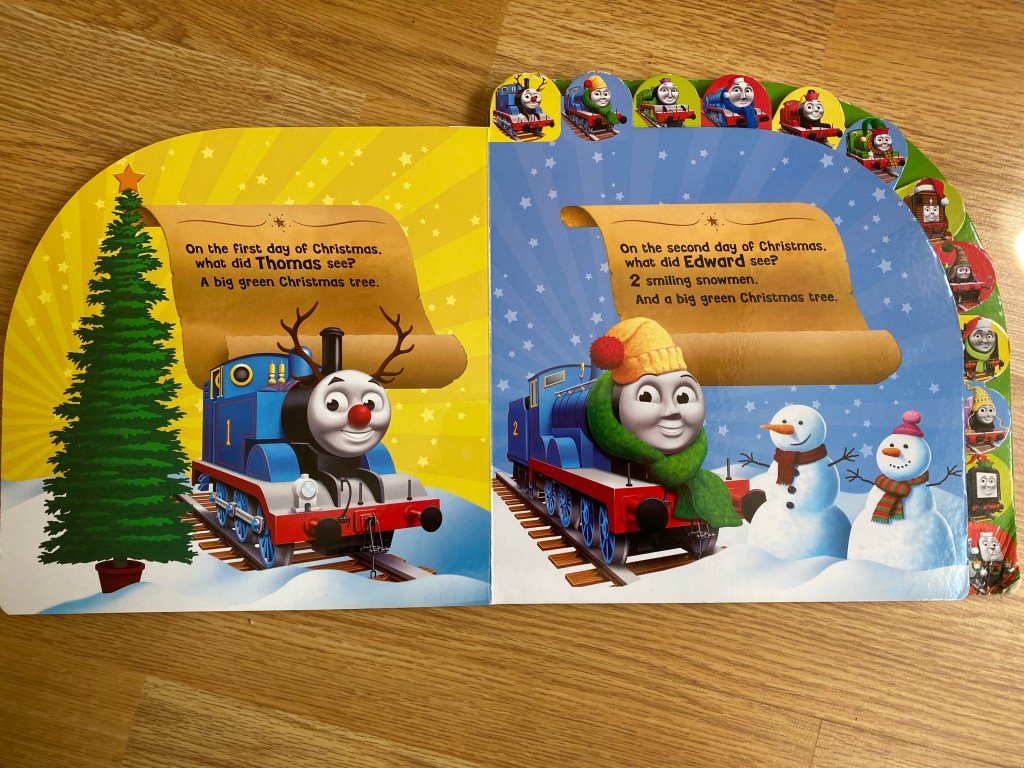 The 12 Engines of Christmas, as you can see from the front cover, is a re-writing of the song for fans of Thomas the Tank Engine. We went through quite the train obsession phase when my son was very young and everything was Thomas the Tank Engine based. We have had this book for about 4 years now, and as mentioned above, both children love to have it as their bedtime book no matter the time of the year. It is quite dog-eared now. It is a board book, so stands up well to small people trying to chew it and their general heavy handedness. There are large tabs along the top edge of the book to make it easier for small children to turn the pages by themselves, and each engine has their own page. It starts with the first day of Christmas “what did Thomas see?” (as Engine number 1 on the Island of Sodor, of course Thomas must go first) and works through 11 more engines and what Christmassy items they saw.