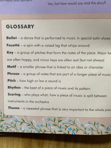 At the end of the story, the book gives you a glossary defining some of the terms used that your children may not be familiar with, such as “ballet”, “motif” and “scoring”. There is also a very short biography for the composer along with a very brief introduction to the ballet itself and how it is usually performed.