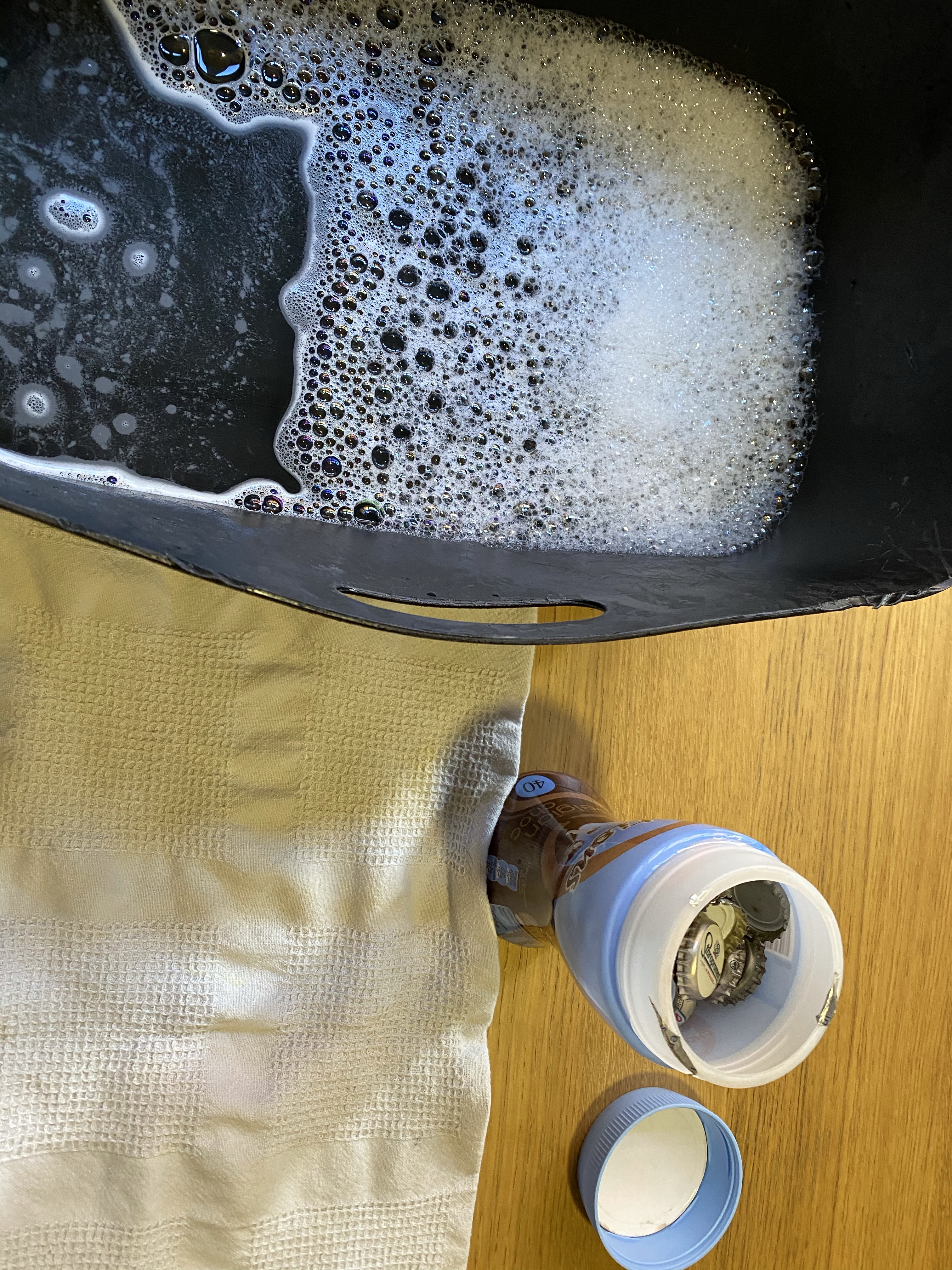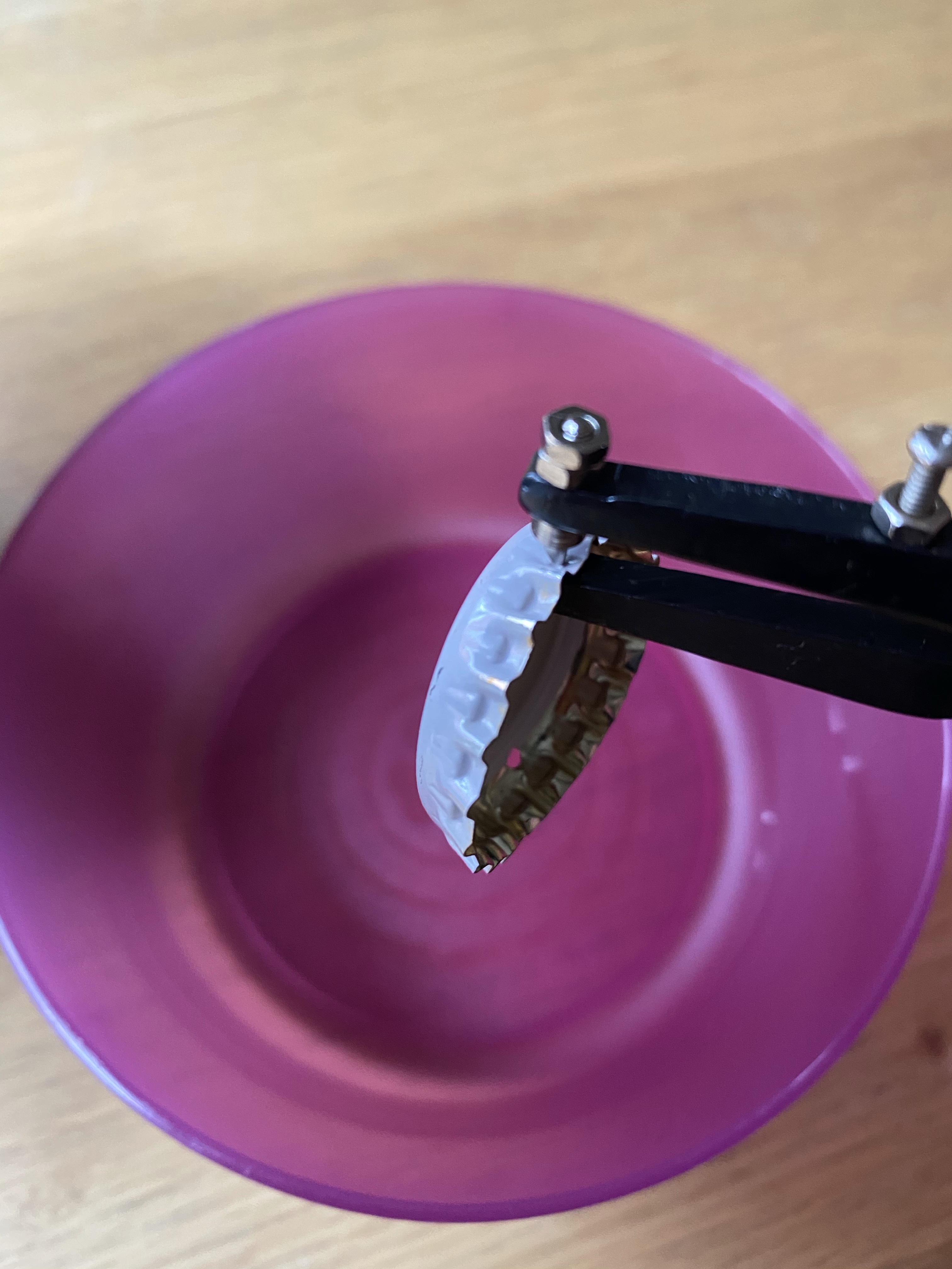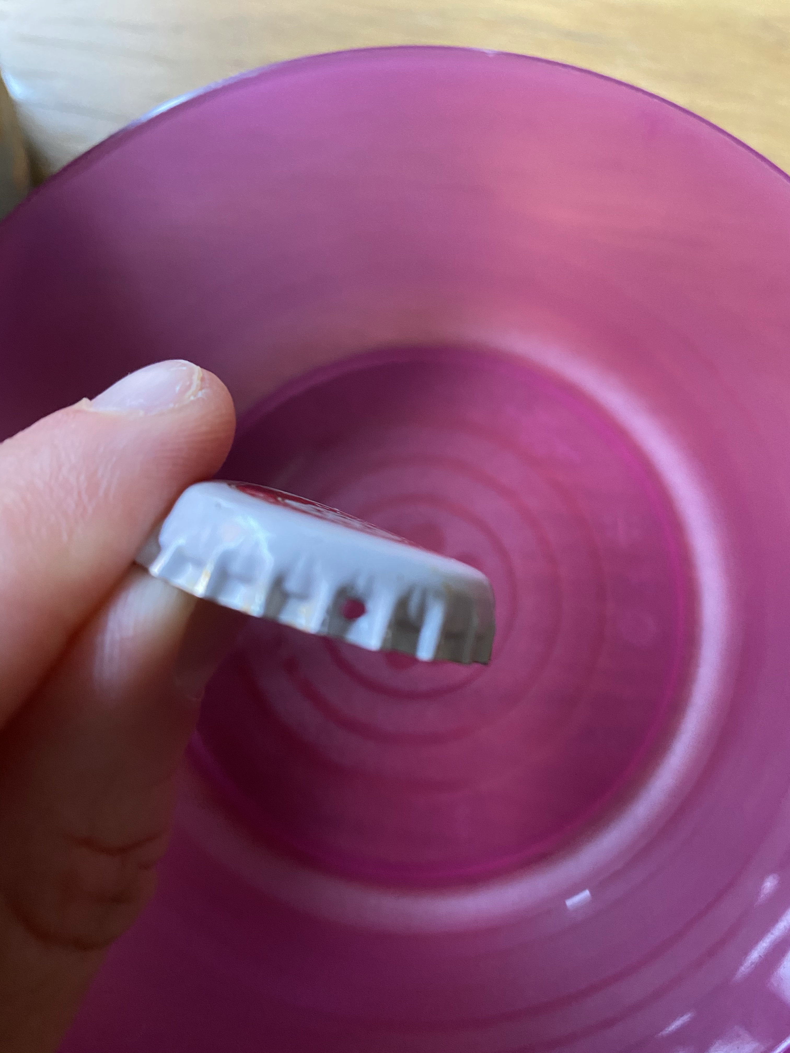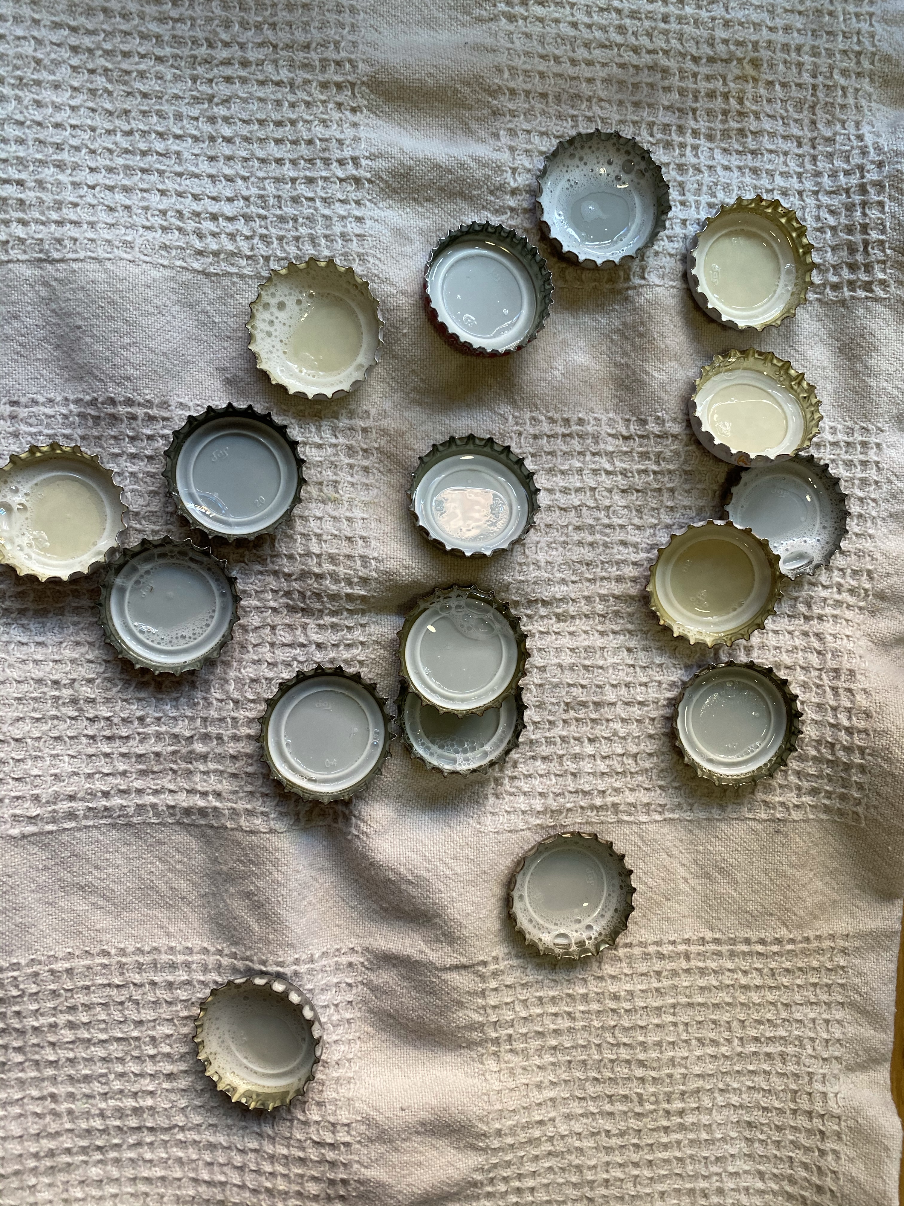 As I had been collecting the bottle tops for some time, the first task when making this wind chime was to give them all a good wash and dry. An odd experience to be sat at the kitchen table washing old beer bottle tops I have to say!