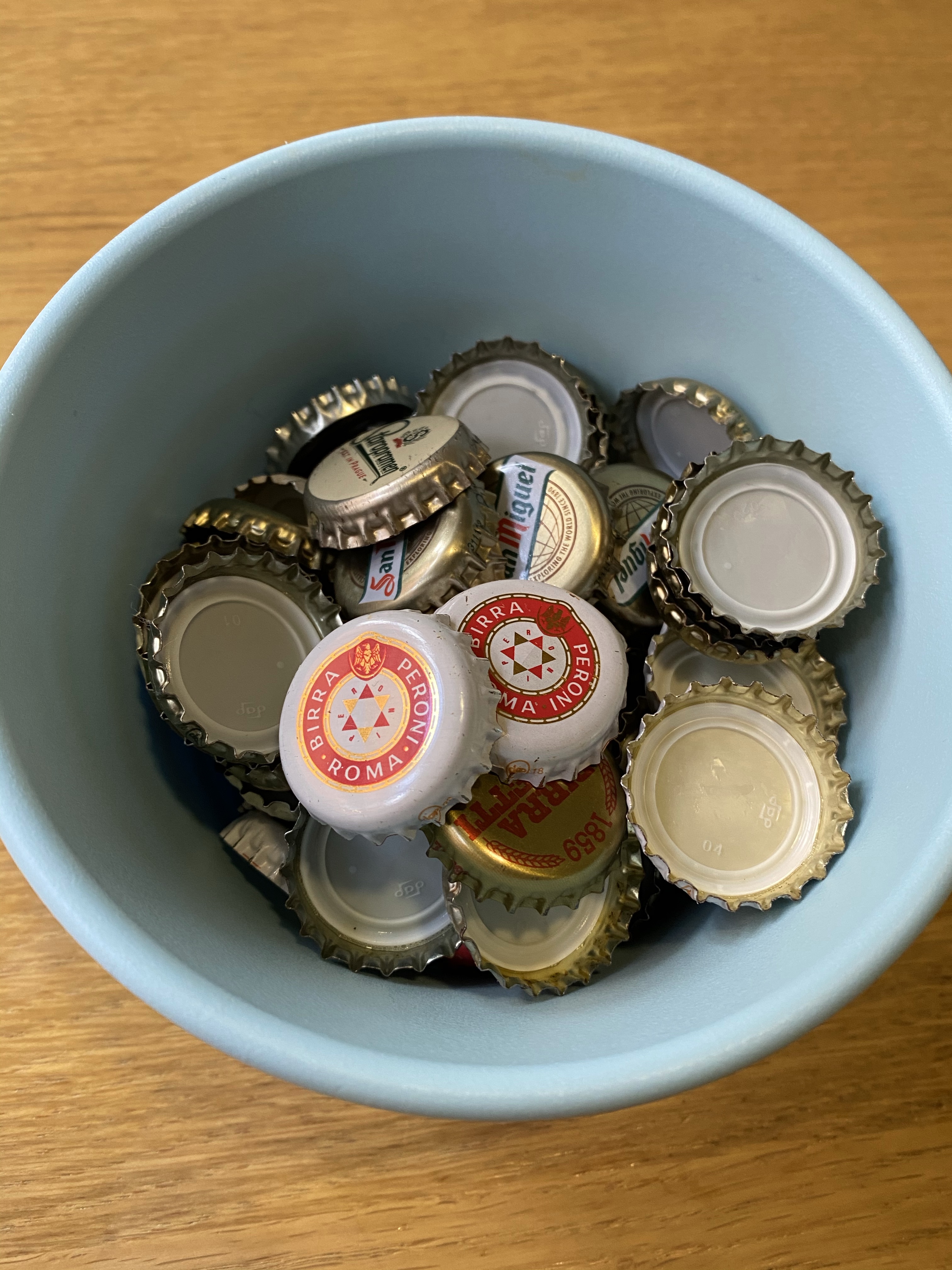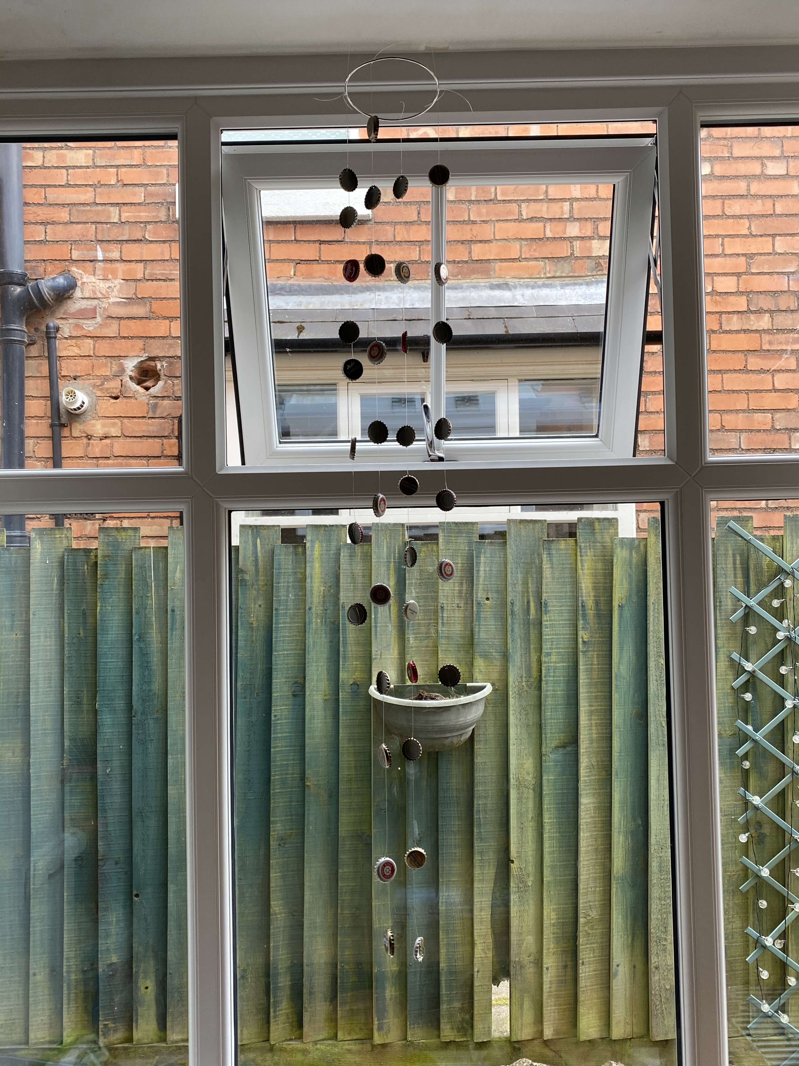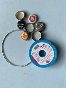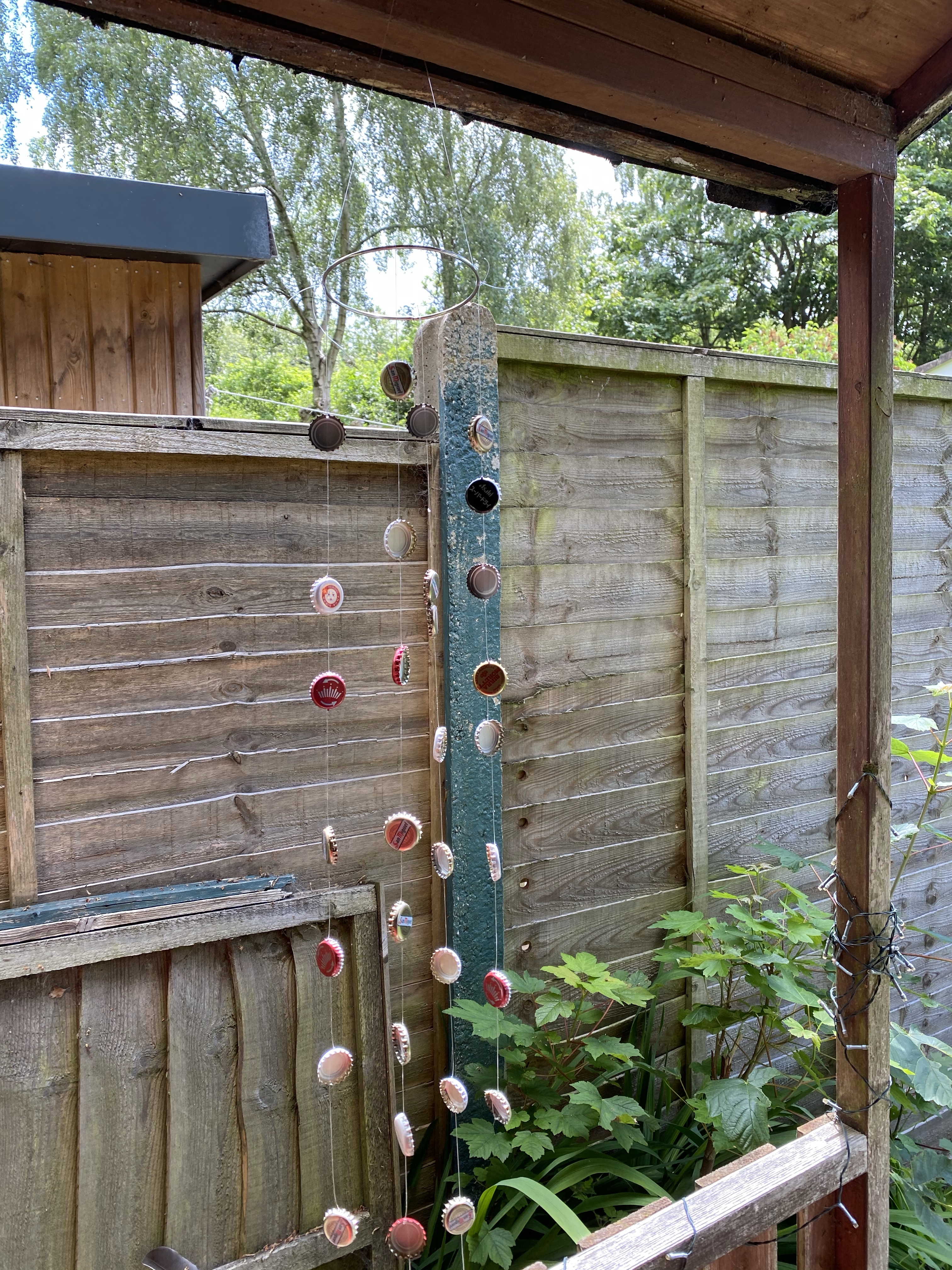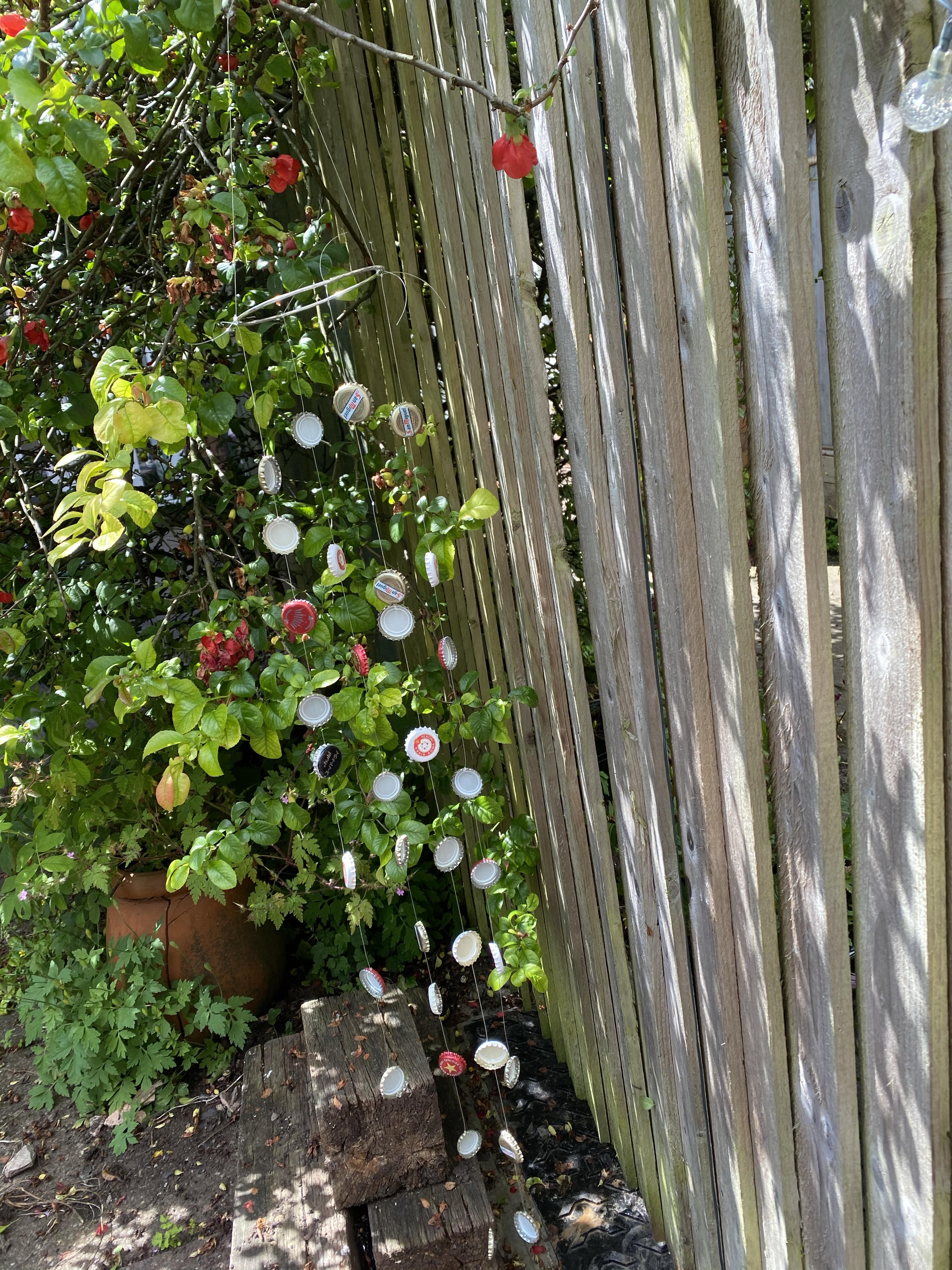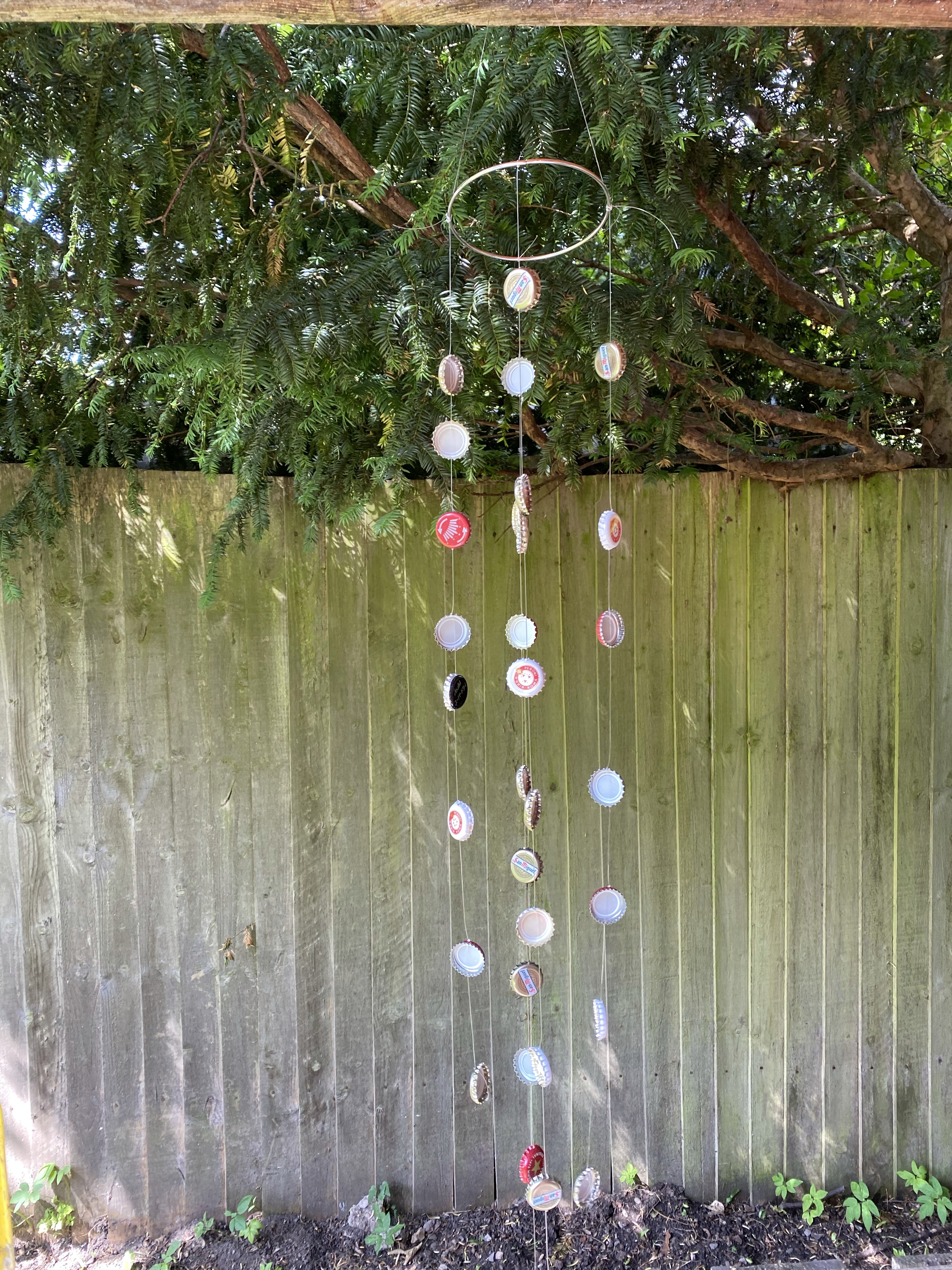 I have been planning this wind chime for ages, well over a year in fact and so I started collecting the metal bottle tops when we had a bottled beer in preparation for this in the spring of 2020. I didn’t use all of the bottle tops I had collected, but I think I used about 45 of them for the wind chime.