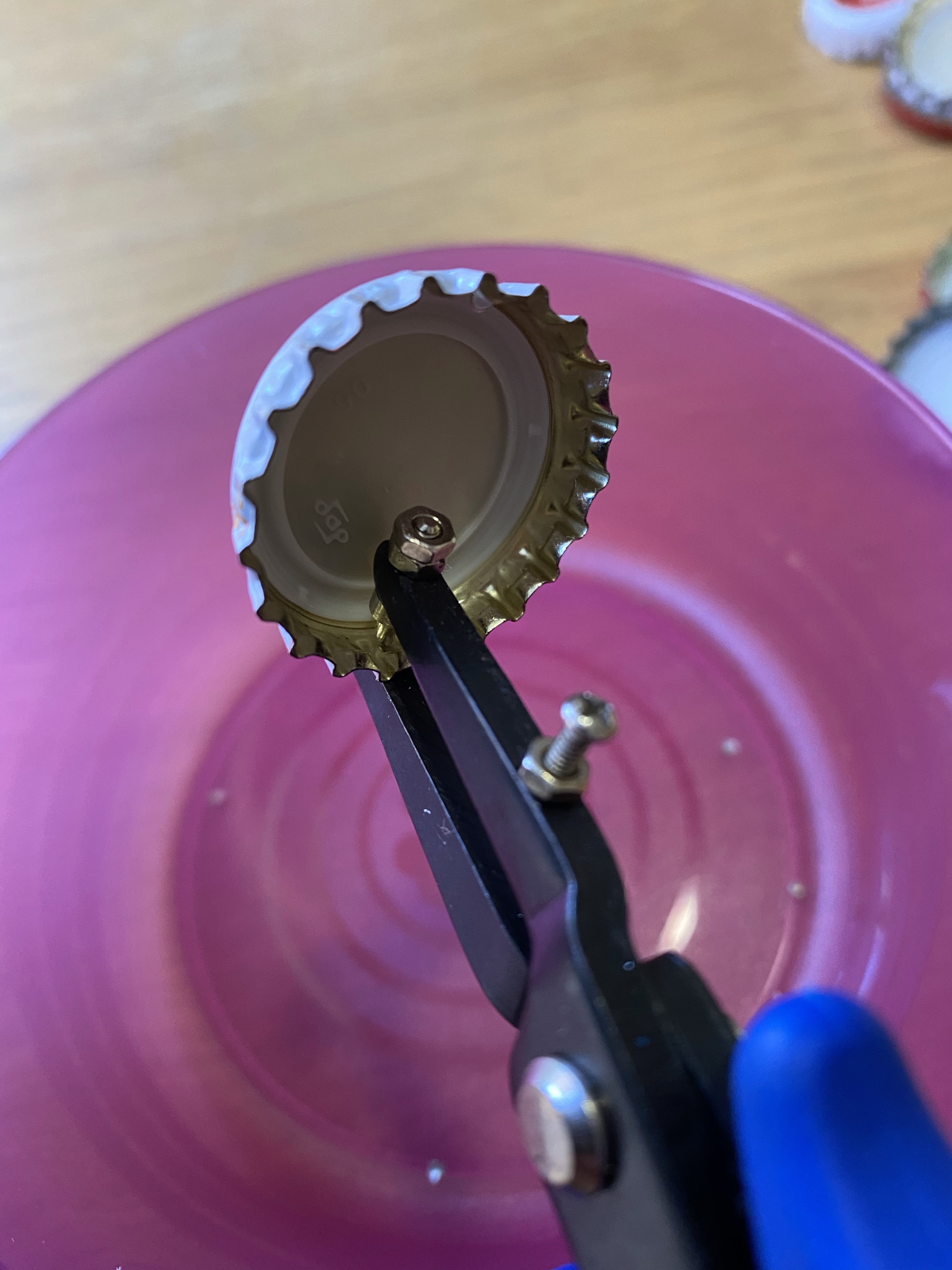 So, this wind chime needs a little equipment to complete such as a drill, or a jewellery hole punch – I guess you probably could use a nail and hammer as well but I think that would be difficult because of the size of the bottle tops you will be working with. Basically you need something to help you make a hole in a metal bottle top.