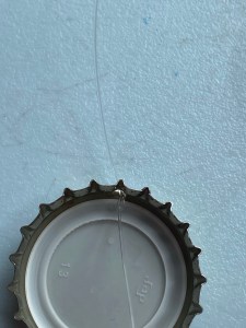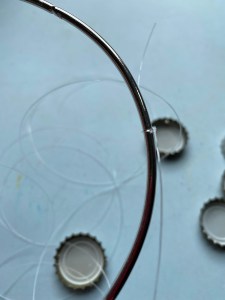 I then used my jewellery hole punch to make holes in the sides of the bottle tops. I knew that I would want to thread the fishing wire through both sides of the bottle top, so roughly aligned the holes to be able to do this. While it was pretty easy to punch holes in all of the bottle tops, because they are made with quite thin metal, there was one brand with gold colouring on it that had far softer metal than the other brands. I would say that it probably took about 45 minutes to wash, dry and hole punch all the bottle tops, and this was doing more bottle tops than I really needed to use as I wasn’t sure how large I wanted to make the wind chime.
