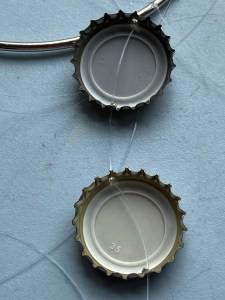 I threaded the fishing thread through the top hole in the bottle top, and knotted the thread just underneath the hole so it could not slide up and down the thread, and then through the bottom hole in the bottle top, this time not bothering to knot the thread. This way the bottle top lay nice and flat on the fishing thread and none of them stuck out at awkward angles. I thought it looked nicer that way.