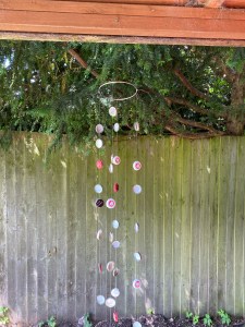 I do love the sound of a wind chime tinkling away in the breeze on a summer’s day. I have previously made a wind chime with some lovely, brightly coloured jingle bells, and if you want to have a look at that post, you can do so here.