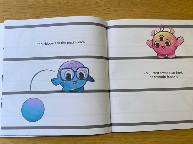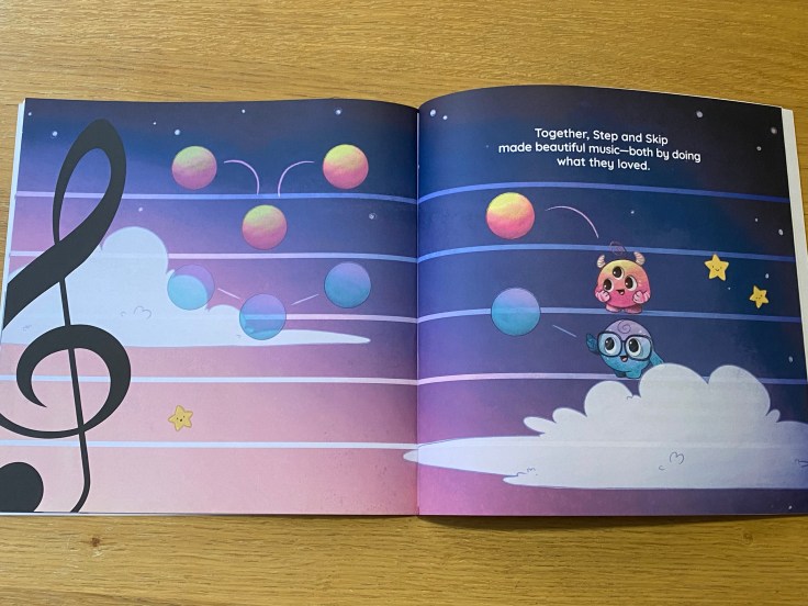 Vicky Weber is a music teacher, teaching young children, and this is quite evident when you read her books. These books tell a story involving music, here about two characters Step and Skip, meeting each other and what happens when they do. Other books tell the story of someone learning to play a musical instrument, or having musically powered super powers! But behind the story, she is actually teaching concepts about music theory (and other valuable life lessons thrown into the bargain) in a fun and engaging way. Each page has a musical staff on it, a set of 5 black lines that musicians use to read and write music. Depending on where a note is placed on that staff – on one of the lines or in one of the spaces, the musician will play a different note. On the left hand side of most pages is a treble clef, a symbol that looks a bit like the ampersand sign – &. This is a symbol that helps to tell musicians what notes they should be playing – generally higher notes where the treble clef is concerned.