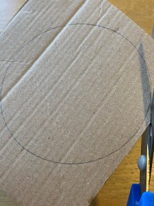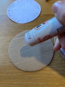 Once you have gathered your supplies together draw a circle on the paper and card using your protractor, or whatever you choose to help you make the circle. Then cut out both the paper and cardboard circle and glue the paper circle onto the cardboard one, just to give your spinner a little structure and help it to spin properly. You could, if you choose, just use the cardboard circle, but I personally thought it looked better using the plain paper.