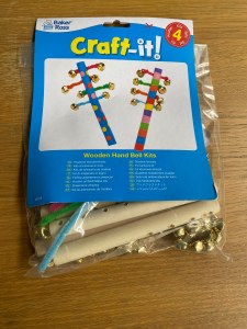 Just a quick note of caution here before I tell you what we did to decorate the clappers, if you are doing these with small children in the house, please be aware that they are not suitable for under 3s because they do have small parts which could be a choking hazard – particularly the bells that are really quite small and easily swallowable. It’s not a big thing, but the card packaging attached to a plastic envelope that the clappers are in is secured with staples that could prick small fingers if they aren’t careful with them. and finally there is a packet of silica gel in the plastic package that your children must not put in their mouth. Basically don’t do this activity with a child under 3, and I would also add here that if you have an under 3 year old in the house, they shouldn’t be playing with the hand bells once they are made as the bells are only secured to the instrument with a pipe cleaner. Older children supervise them as is appropriate for your child.