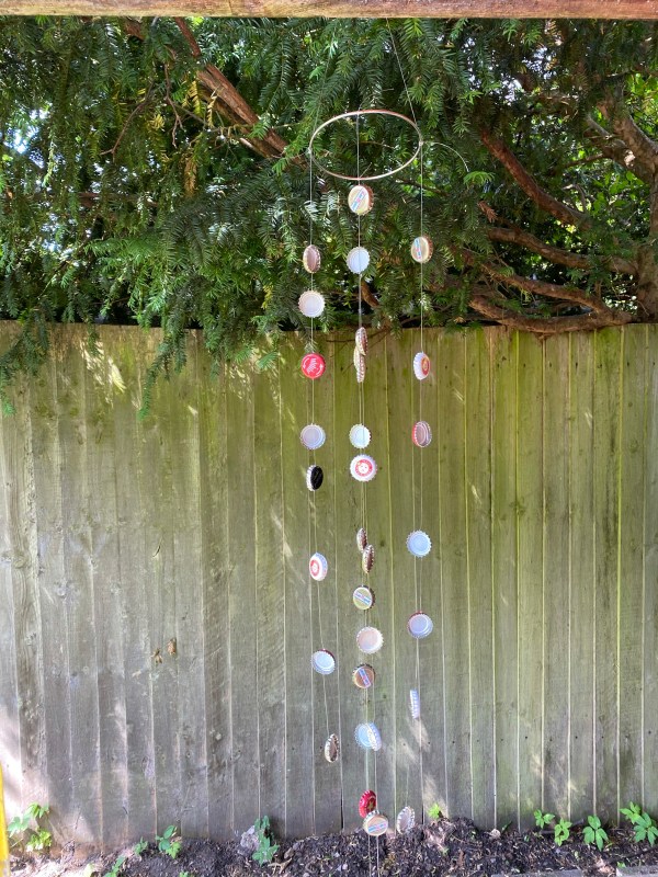 How to make a wind chime for the garden with just metal bottle tops, fishing thread and a dream catcher hoop.
